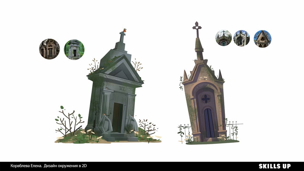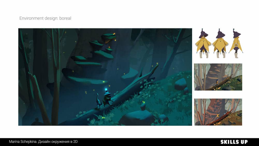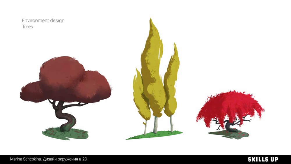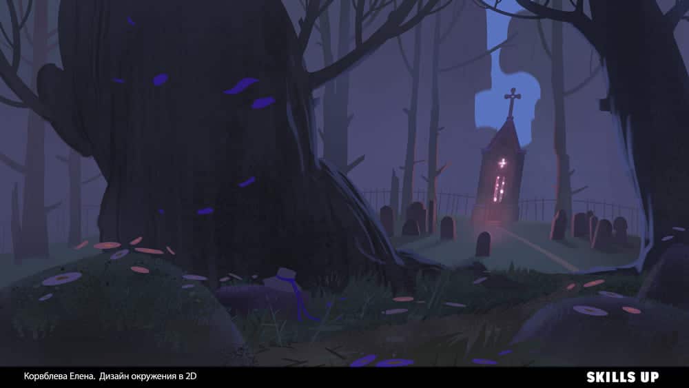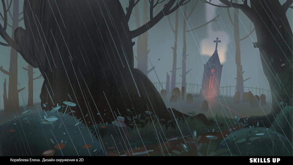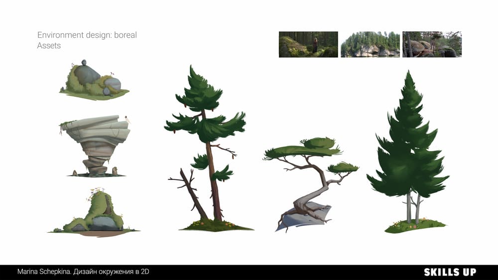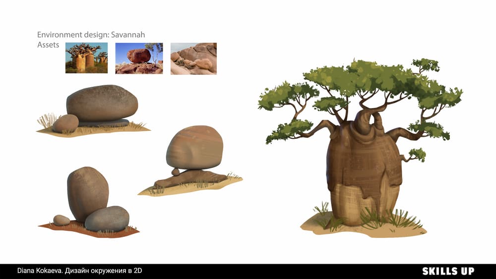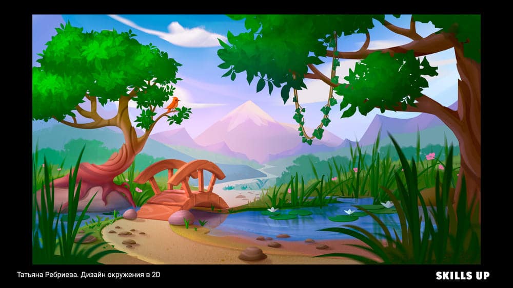 Окружение за секунду погружает зрителя в атмосферу игры, иллюстрации или мультфильма, передает настроение и рассказывает целую историю. В природе встречаются самые разные формы, фактуры, текстуры, погодные явления, состояния среды, и рисование подобных пейзажей отлично прокачивает работу с композицией, освещением, цветом и рендером. По итогу работы на курсе вы пополните портфолио дизайном элементов окружения, природными ассетами (камни, скалы, деревья) в соответствии с выбранной локацией и сеттингом (тундра, тропики и т.д.) и иллюстрацией.